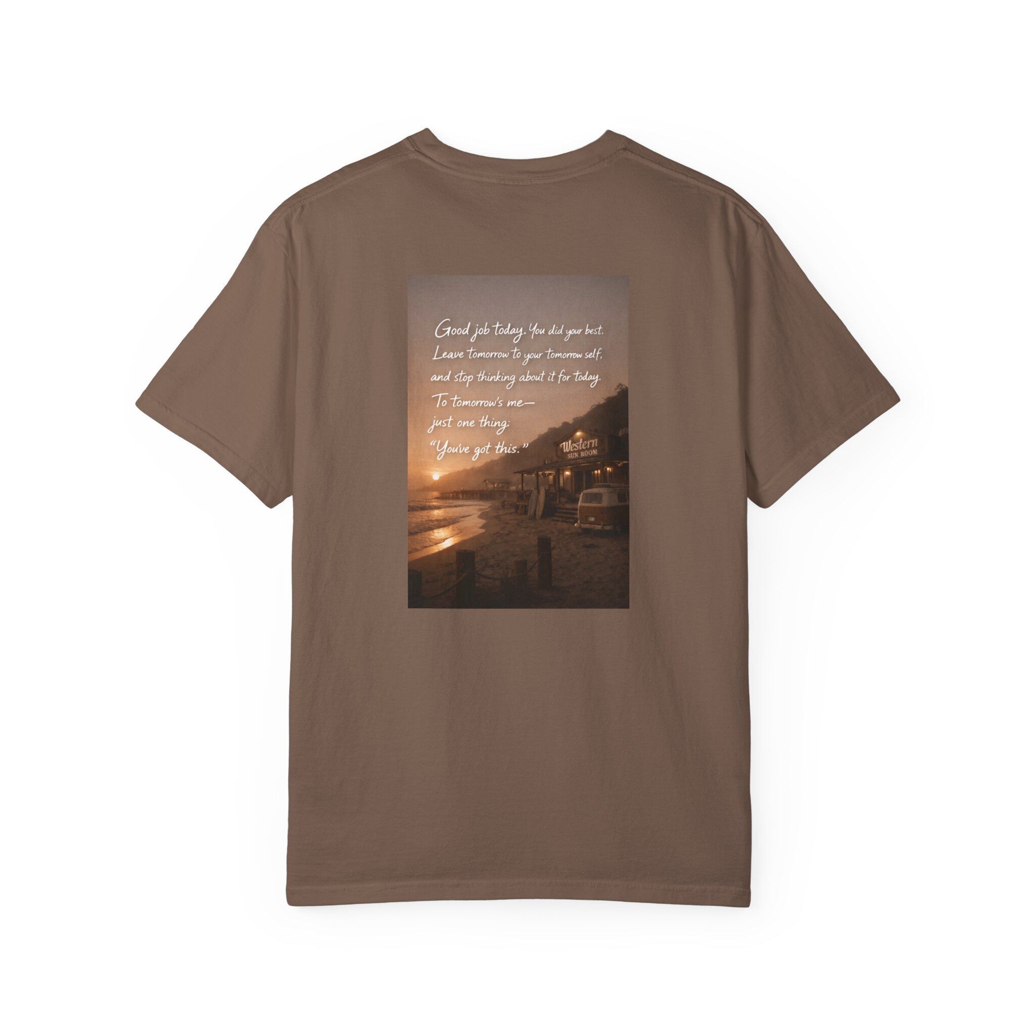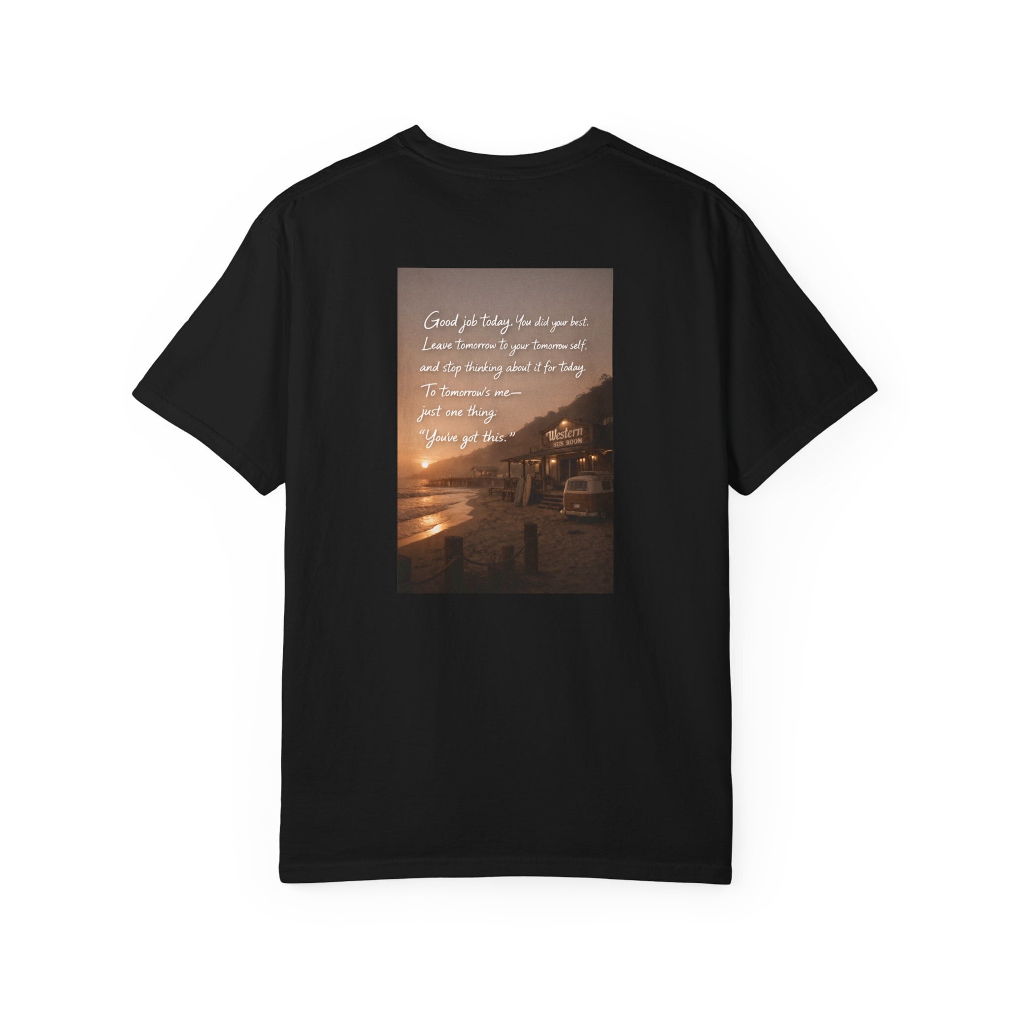 バックには、夕暮れのビーチと静かなメッセージを大胆に配置。